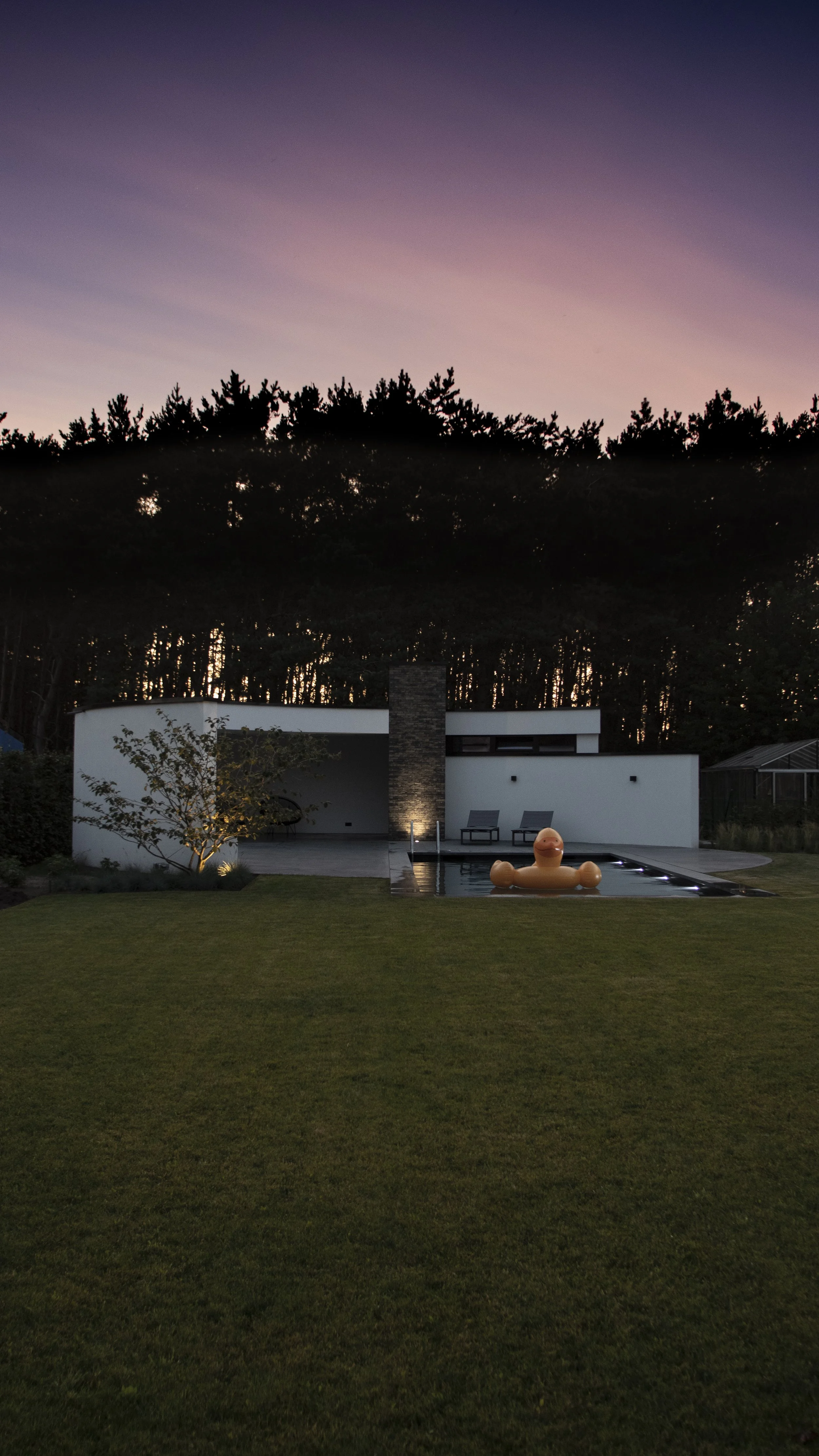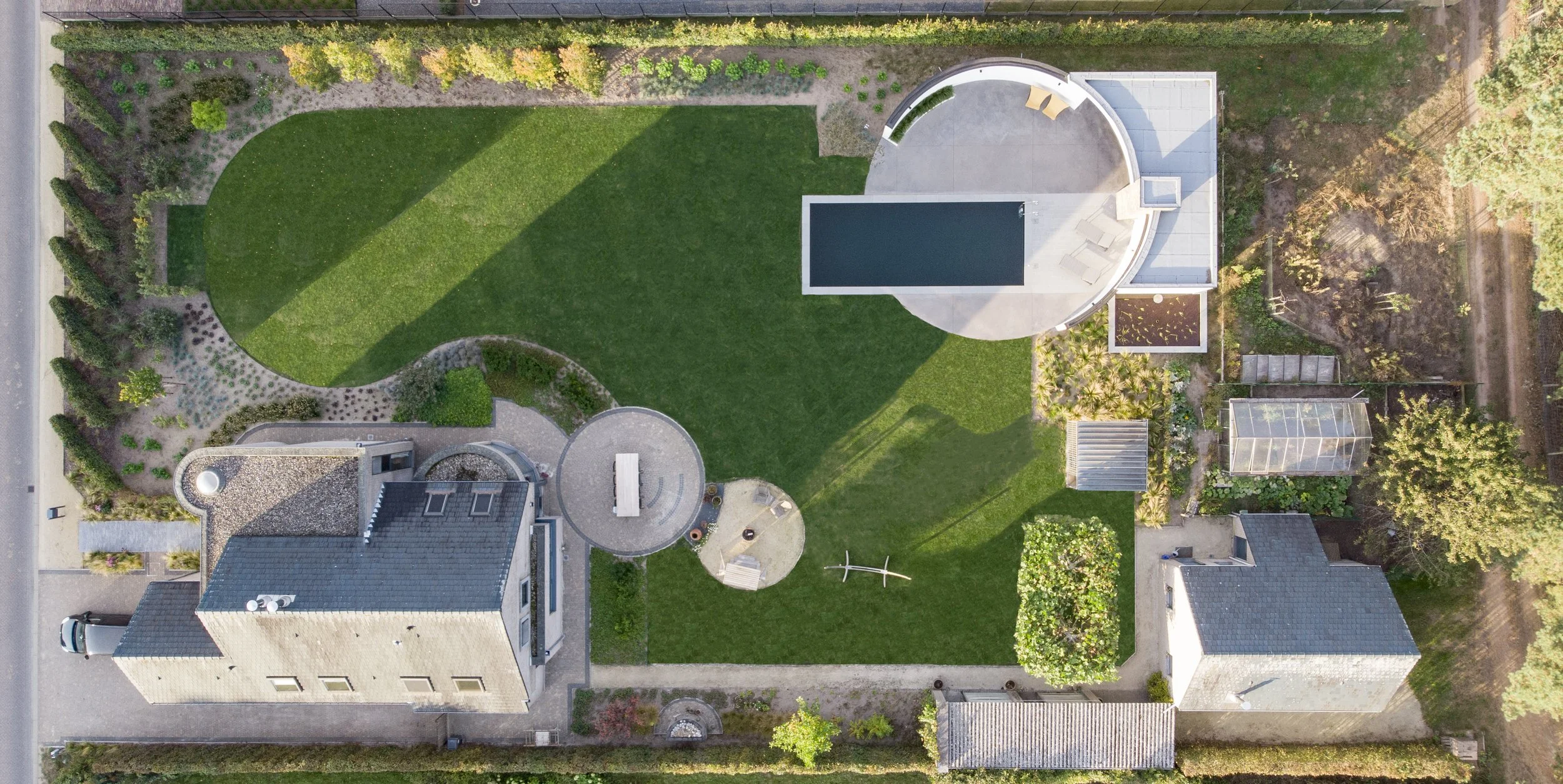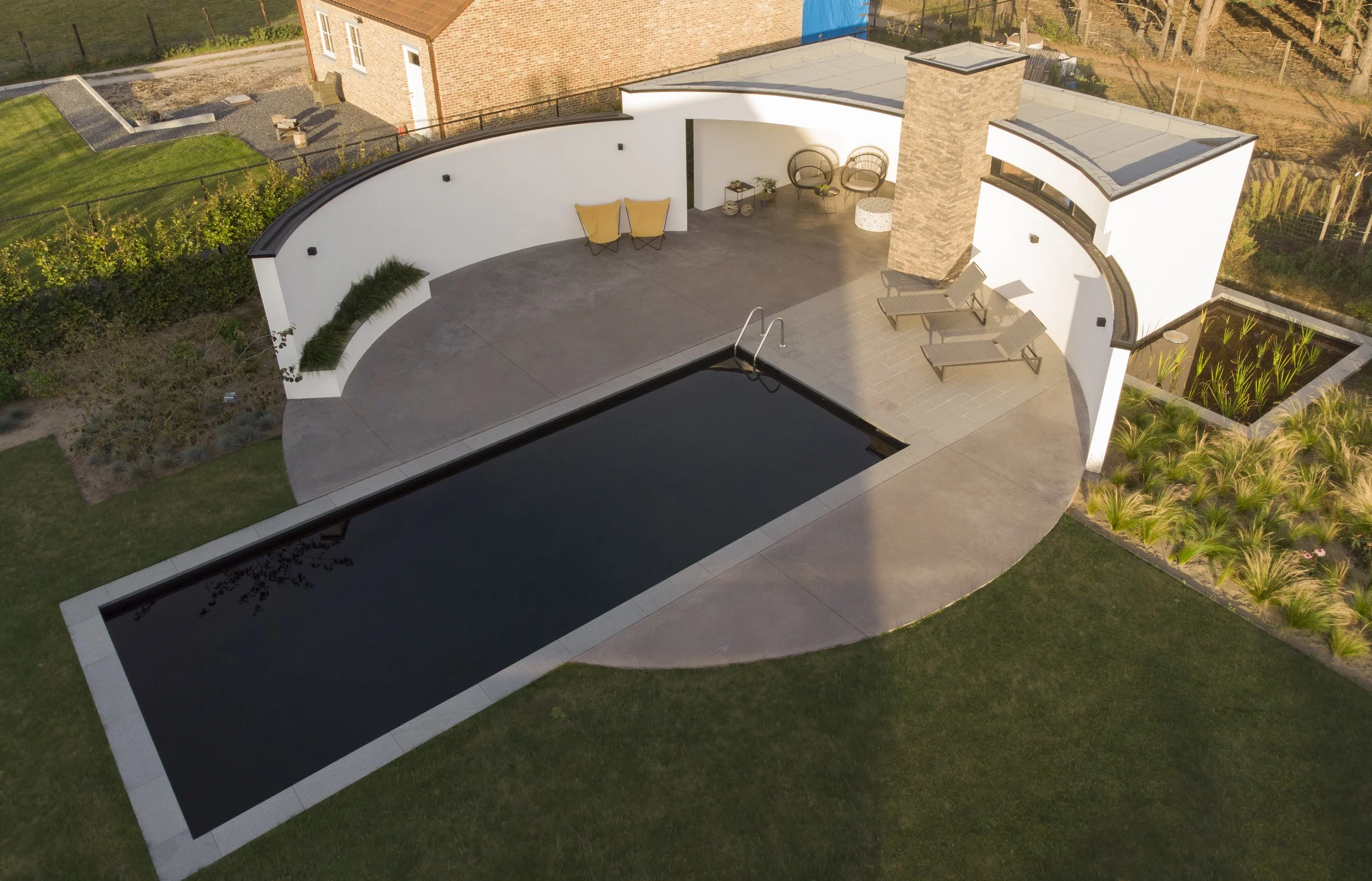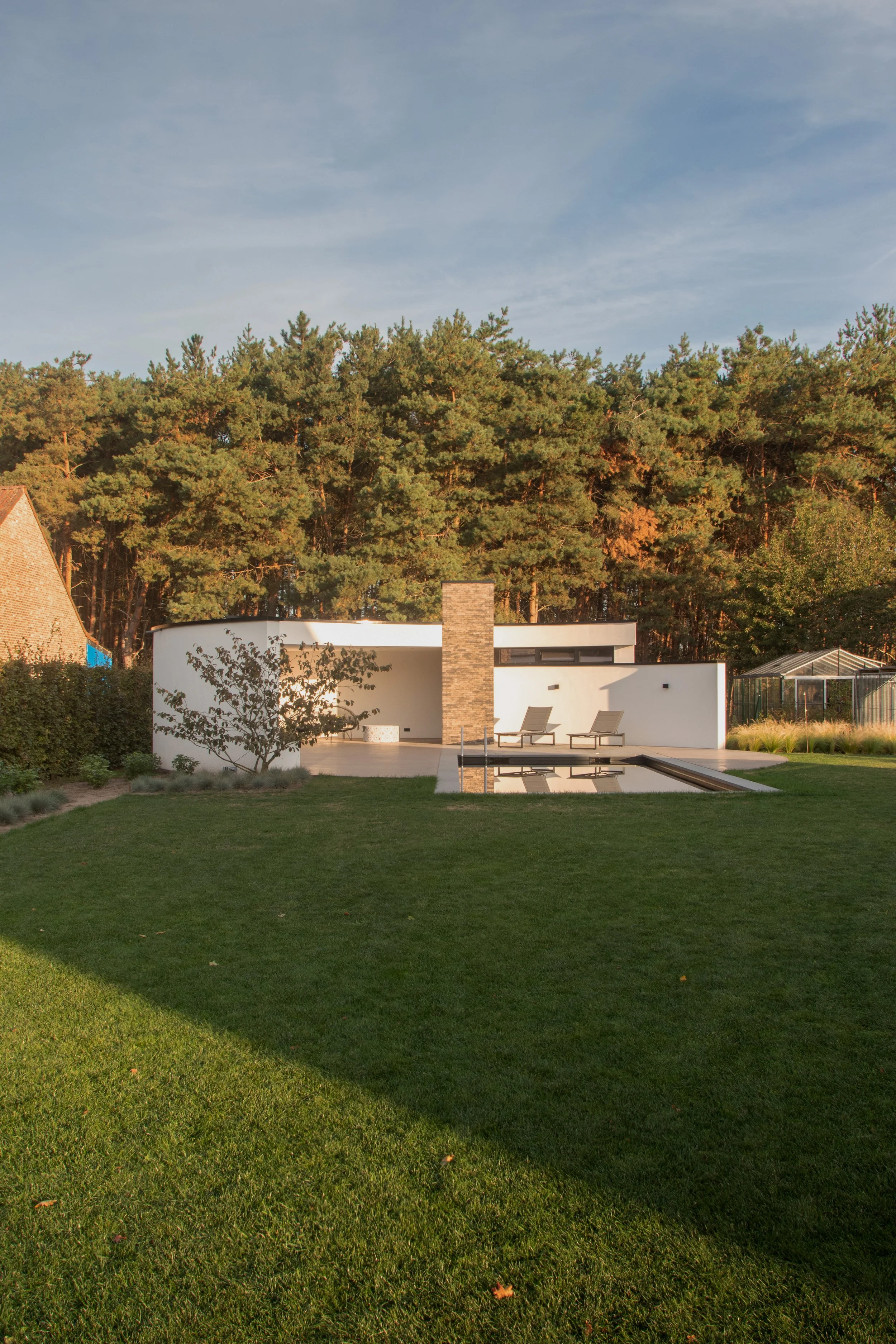 Bij de heraanleg van de tuin werd in het programma voorzien om een zwemvijver aan te leggen met bijhorende poolhouse. Aansluitend op de natuurlijke vormen van de tuin werd een rond terras ingepast waaruit de zwemvijver een snede maakt. De twee gebogen muren die het terras omarmen fungeren als steun voor het volume van de poolhouse die hier op subtiele wijze op leunt.