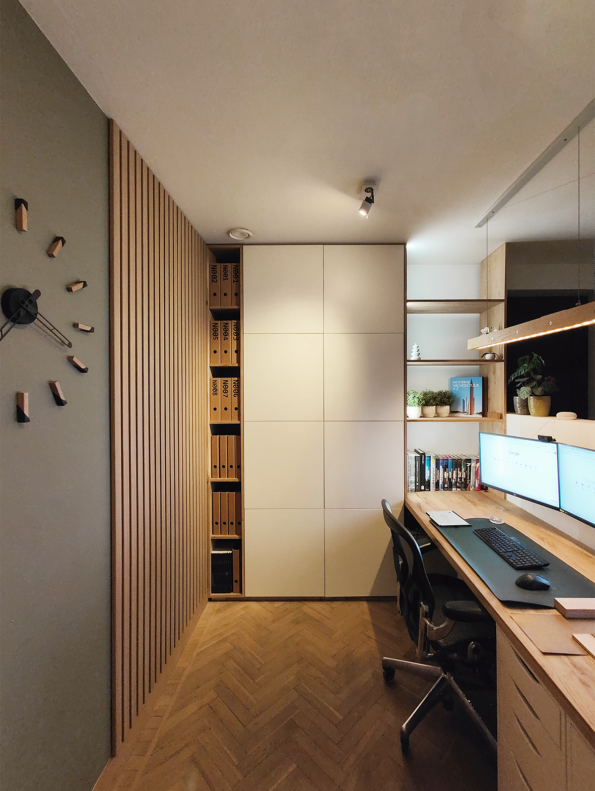 Centraal in de woning werd een brede gang voorzien, die doorheen de hele woning doorloopt over de niveaus heen. De overmaat van deze gang zorgt ervoor dat deze ruimte meer is dan enkel circulatie en creëert ruimtelijkheid en zichten in de woning. Op het gelijkvloers mondt deze uit in de leefruimte waarbij een nadrukkelijk zicht op de tuin de aandacht trekt. Op de verdieping loopt deze circulatie-as over in een gezellige thuis bibliotheek die aansluit op het ruime dakterras.